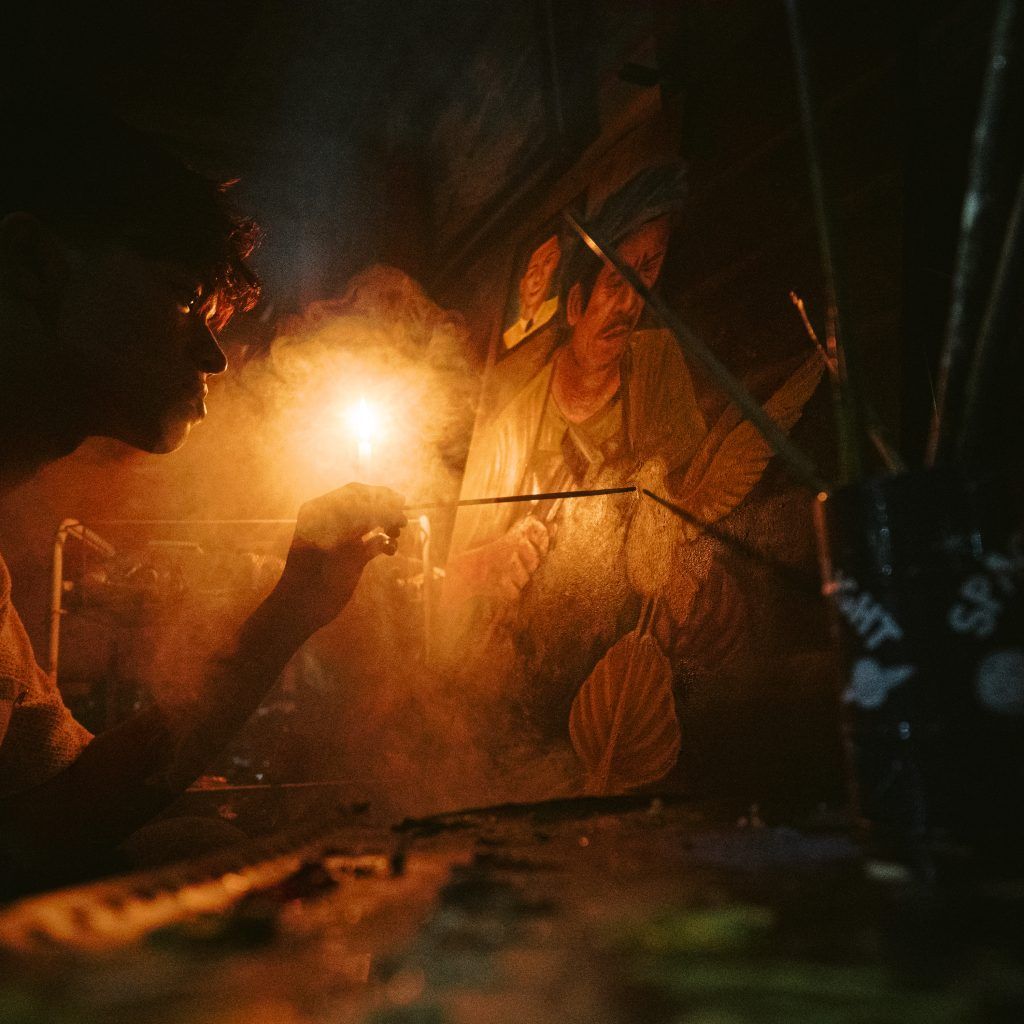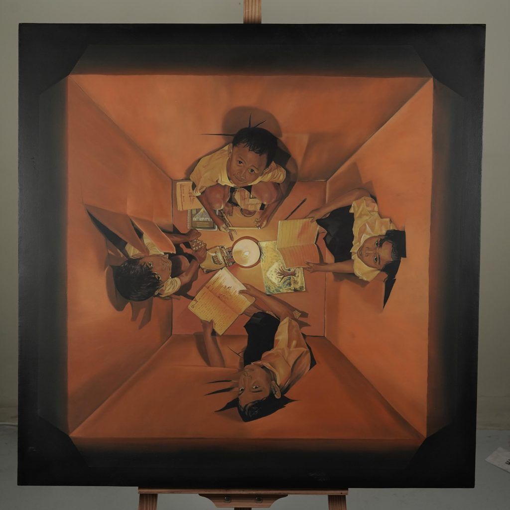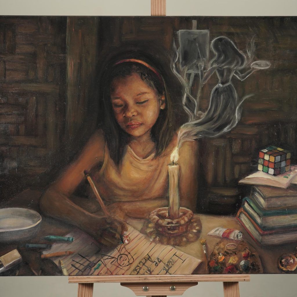 The first-place winner in the Oil/Acrylic category is “Usok na Nagiging Buhay” by Ruth Cenas of the University of the Philippines – Mindanao. The painting shows a young dreamer sketching by candlelight. Where rising smoke forms the image of a painter, symbolizing the future she hopes to build.
