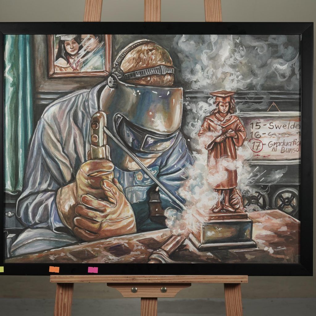 The third-place winner is “Kinsesas” by Keth Byonnsey Estilo of Eulogio “Amang” Rodriguez Institute of Science and Technology. The painting highlights a father who works as a welder, with the sparks representing his love and dreams for his daughters’ future.
