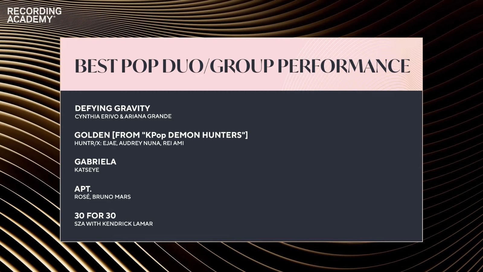 BLACKPINK member ROSÉ also made GRAMMYs history as the first credited K-pop soloist to be nominated, for her song “APT.” Thus, both K-pop artists vie for their first nominations in Best Pop/Duo Group Performance and general field categories: Record of the Year and Song of the Year.