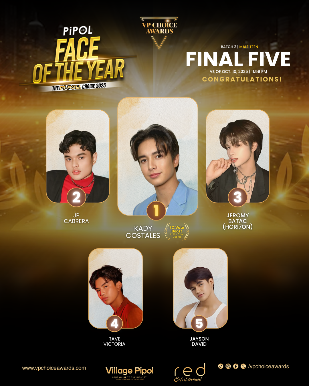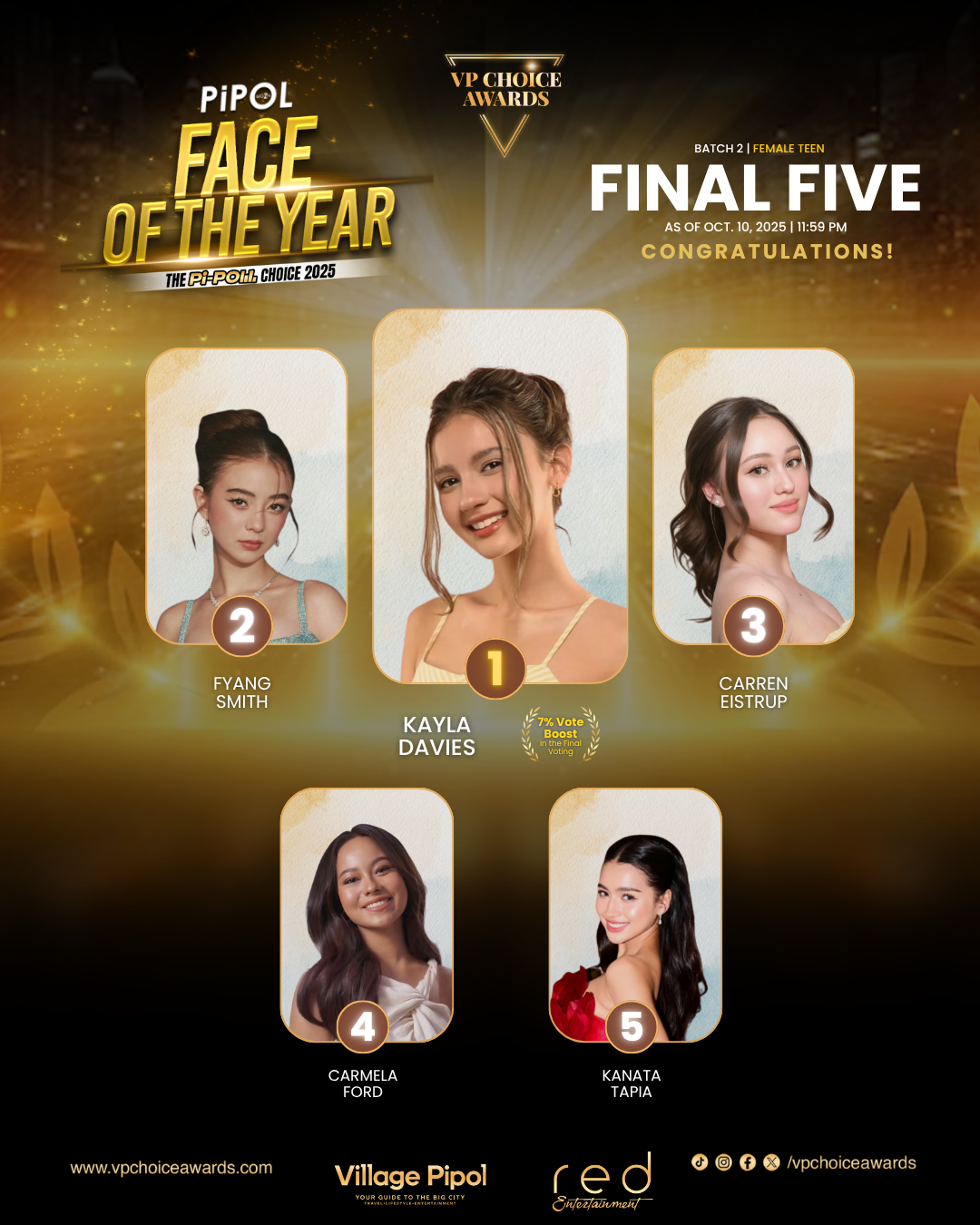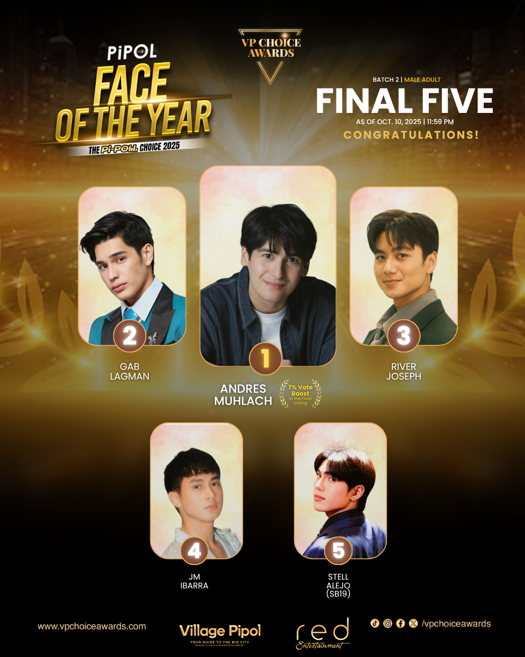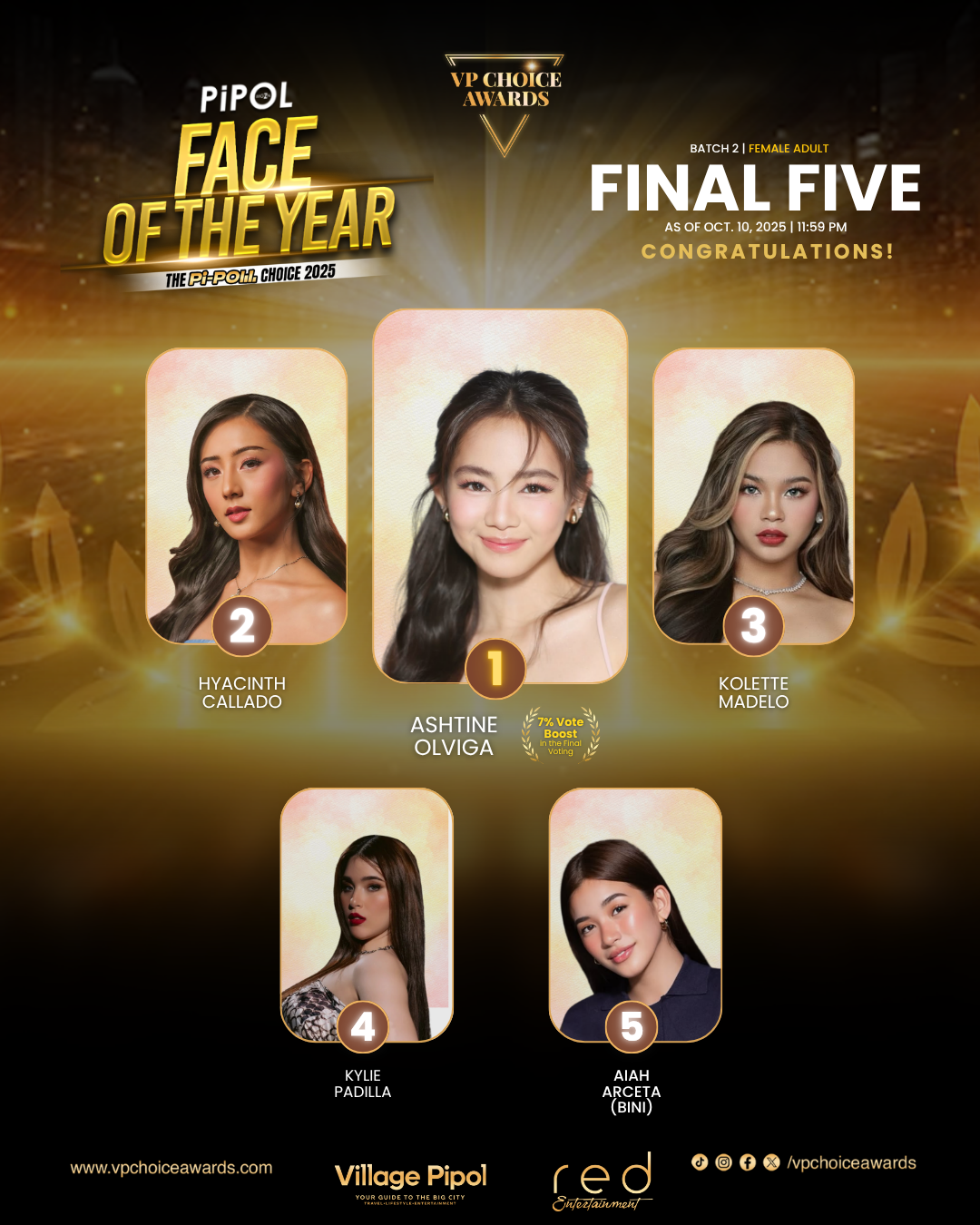 From September 15 to October 10, fans cast their votes for nominees of Face of the Year Male and Female (Teen & Adult), and Sexiest Male and Female of the Year. The voice of the Pi-Poll determined which stars rose above everything and resonated strongly with them. Ultimately, the Batch 2 Final Five emerged.